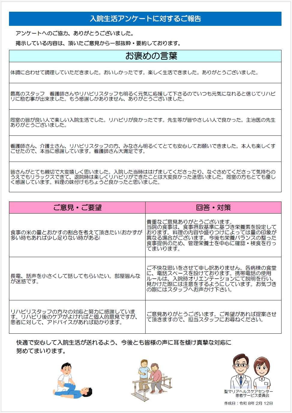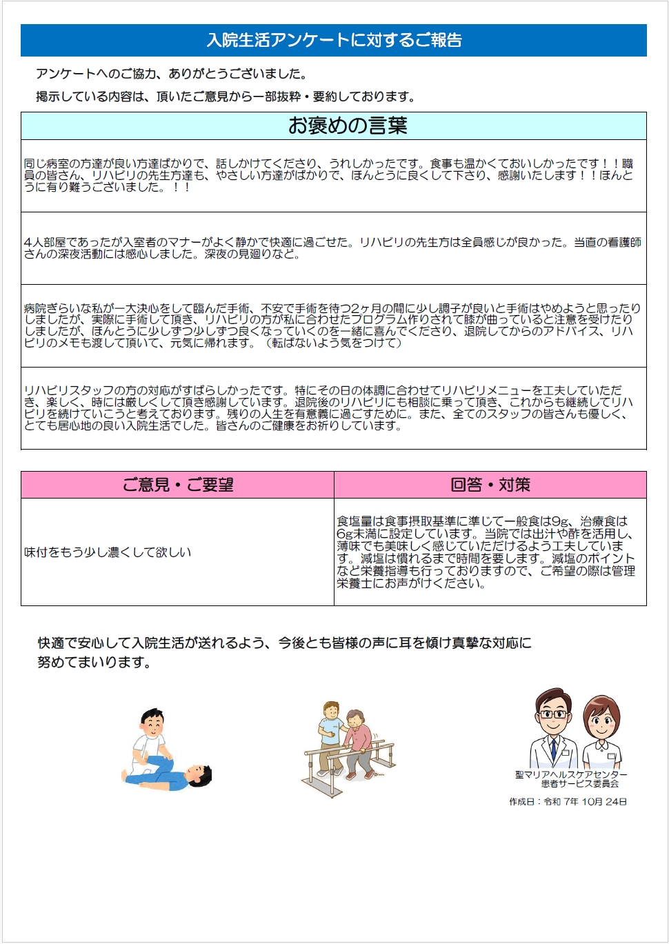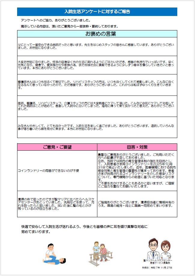 聖マリアヘルスケアセンターでは、当院を利用される皆様が安心して診療や医療サービスを受けていただけるように、毎月当院に寄せられるご意見をもとに医療サービスの改善および質の向上に取り組み、より一層期待に応えられる病院づくりを目指し、活動しています。